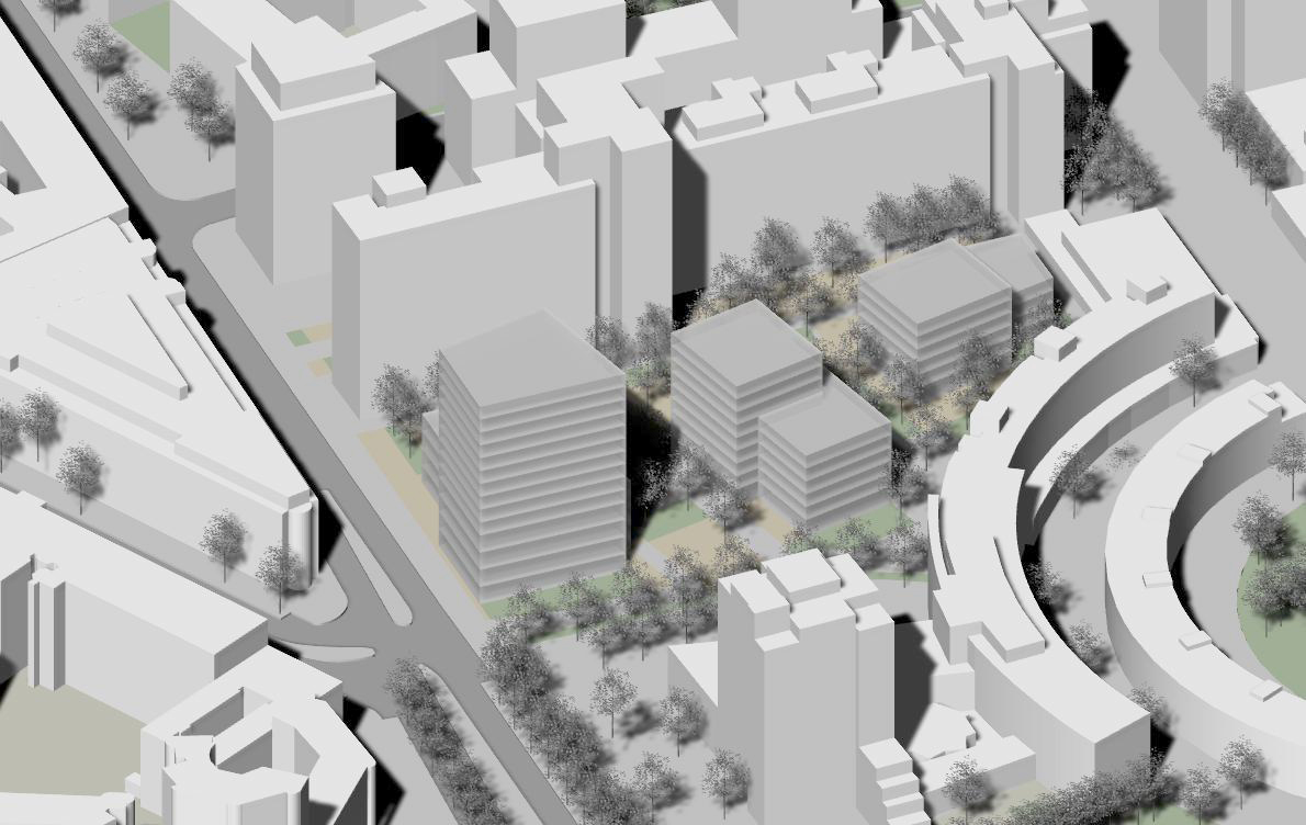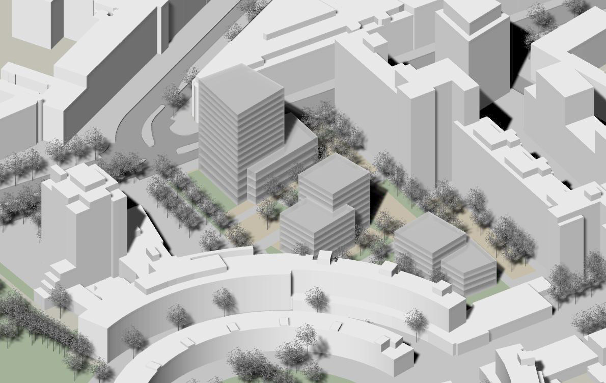 Konkretisiert und in verkleinertem „Fußabdruck“:- ein 14-geschossiger Turm mit Mischnutzung an der Wilhelmstraße (AOK),