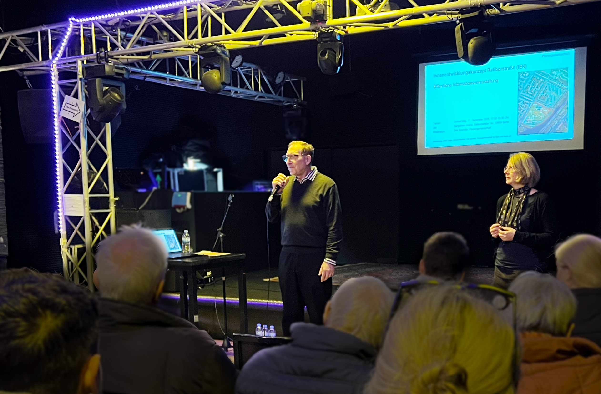 Mit einer öffentlichen Informations­veran­stal­tung am 11. Dezember 2025 im Bier­garten-Lokal Jockel ist der Arbeits­prozess für das Innen­ent­wick­lungs­konzept (IEK) Ratibor-Areal offiziell gestartet. Rund zwei Stunden lang informierten Bezirksamt, Nutzer*innen und die beauf­tragte Planer­gemein­schaft über Ausgangs­lage, Ziel­setzung und geplanten Ablauf des Verfahrens – und kamen anschließend mit Anwohner*innen, Gewerbe­trei­benden und Ini­tiativen ins Gespräch.
