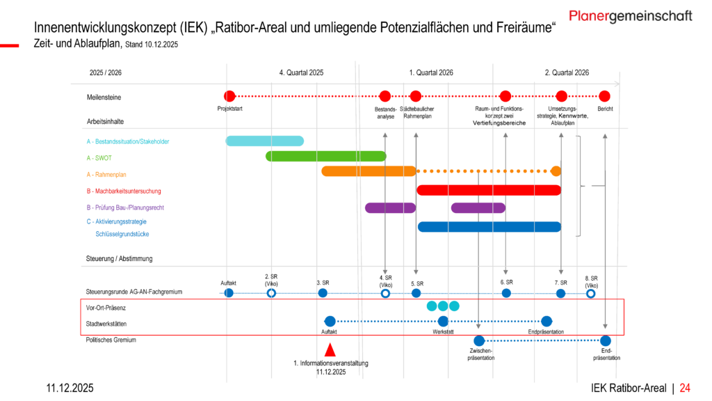 Der vorgestellte Zeit- und Ablaufplan sieht eine Bearbeitung bis Mitte 2026 vor, mit mehreren Stadtwerkstätten, Steuerungsrunden und öffentlichen Zwischenschritten.