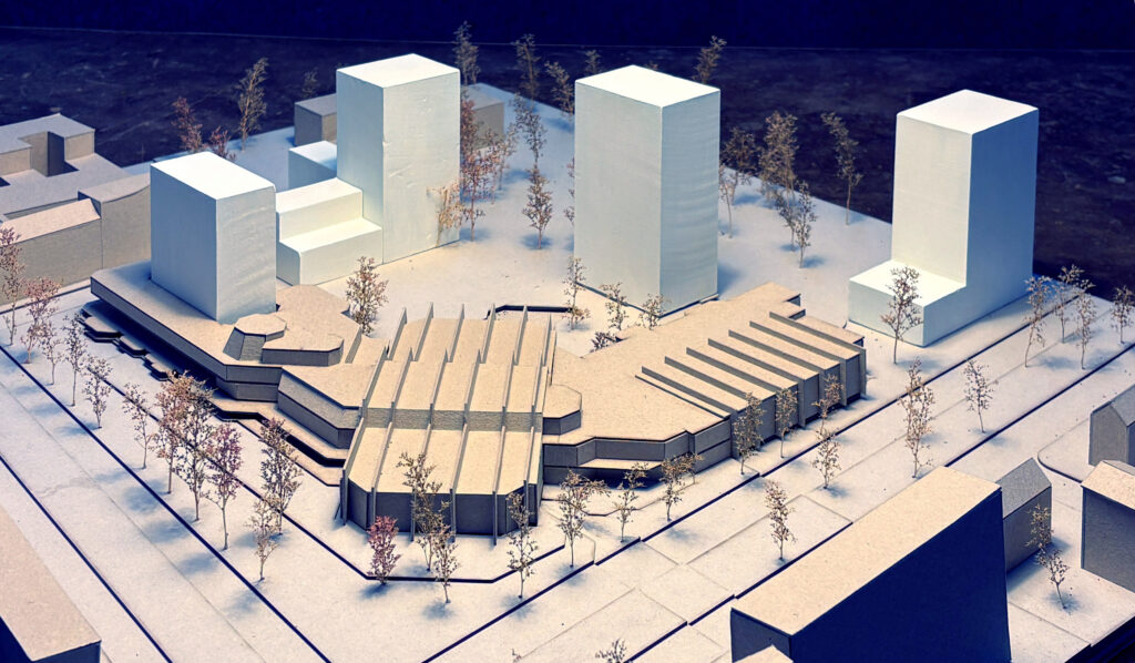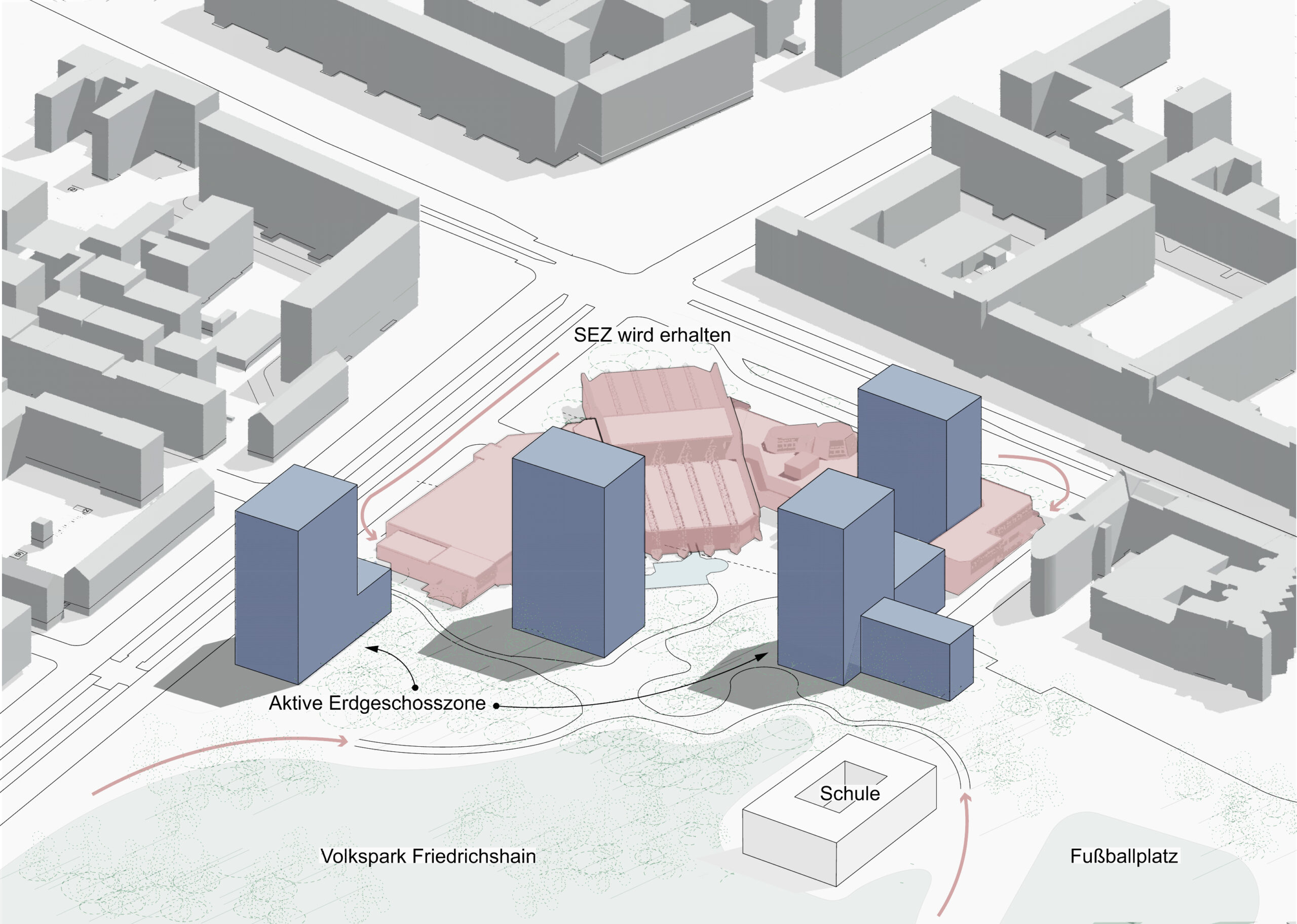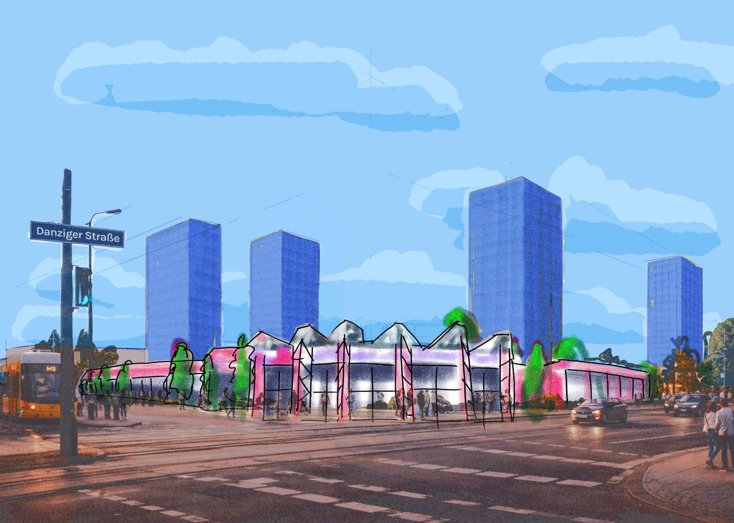 Visualisierung 1 zeigt künstlerisch die Fassade des SEZ mit angedeuteten Baukörpern im Hintergrund, Blick Richtung Westen (von der Kreuzung aus)
